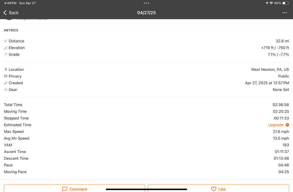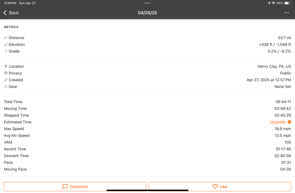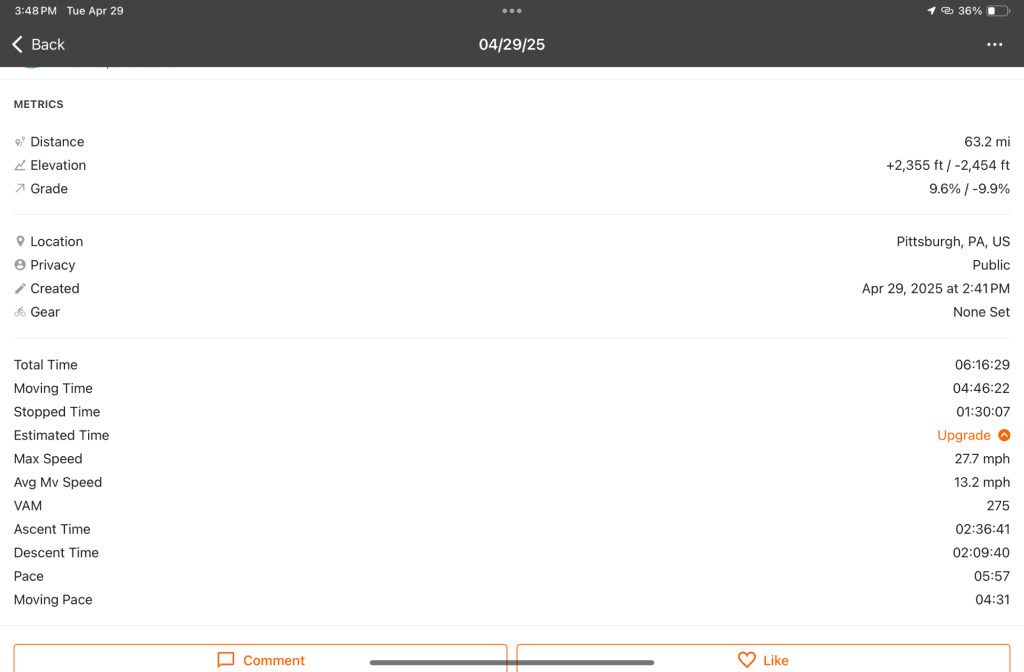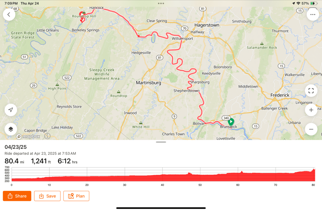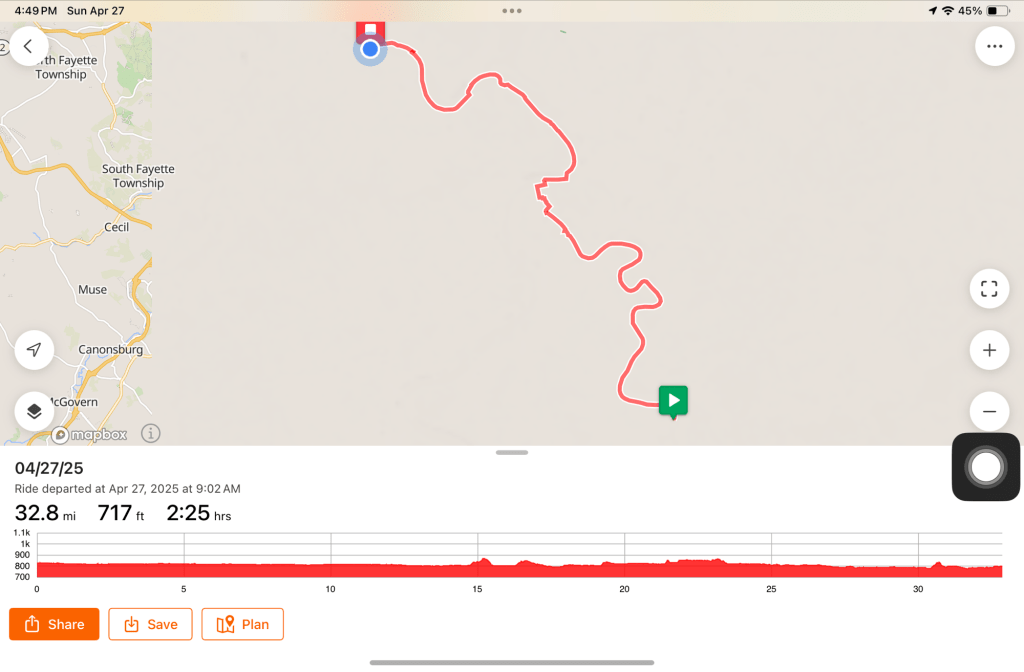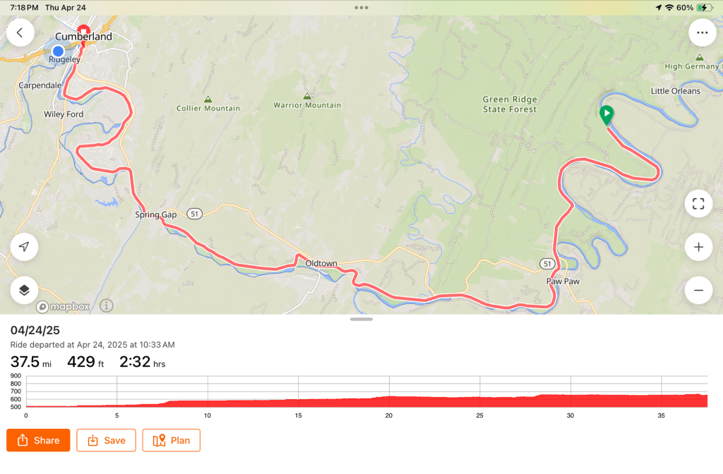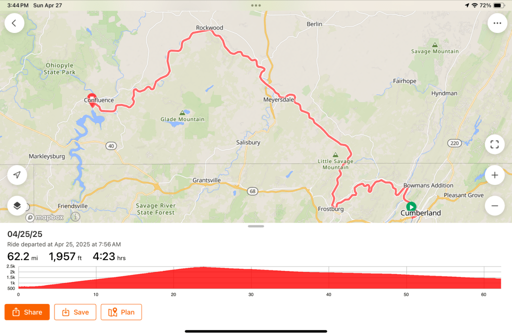 A good day today- 63 miles and 2,355 ft of elevation gain going from Pittsburgh to Wheeling, West Virginia. Nice weather starting off in the high 60s and getting into the 70s, partly cloudy. It was a bit windy in stretches and it was a dead-on headwind, so a bit challenging! And there were some nice hills- first getting out of Pittsburgh to the south there was a big one, and then right after we got into West Virginia a couple pretty challenging 9% grades. After that we dropped into the Ohio valley and followed a nice bike trail the last 20 miles or so along the Ohio all the way to Wheeling. Below are the RidewithGPS stats.