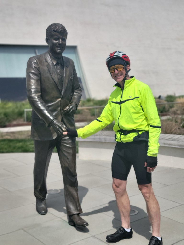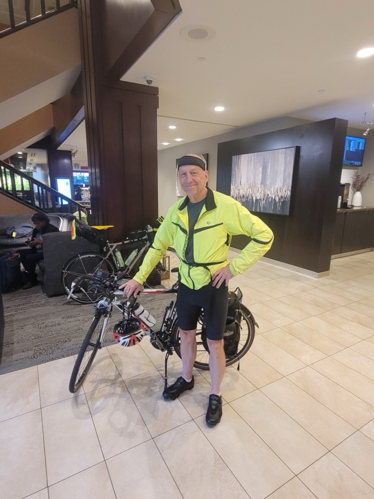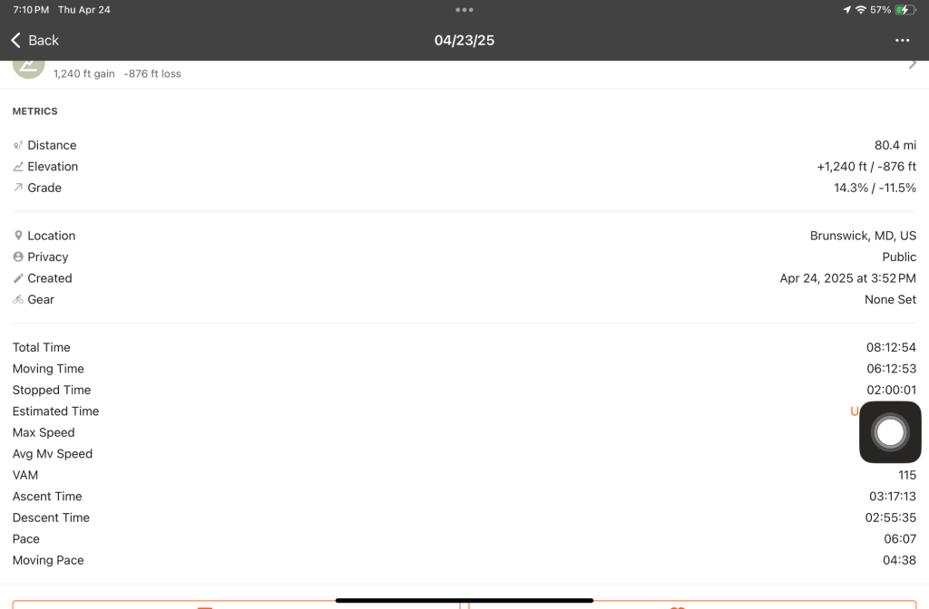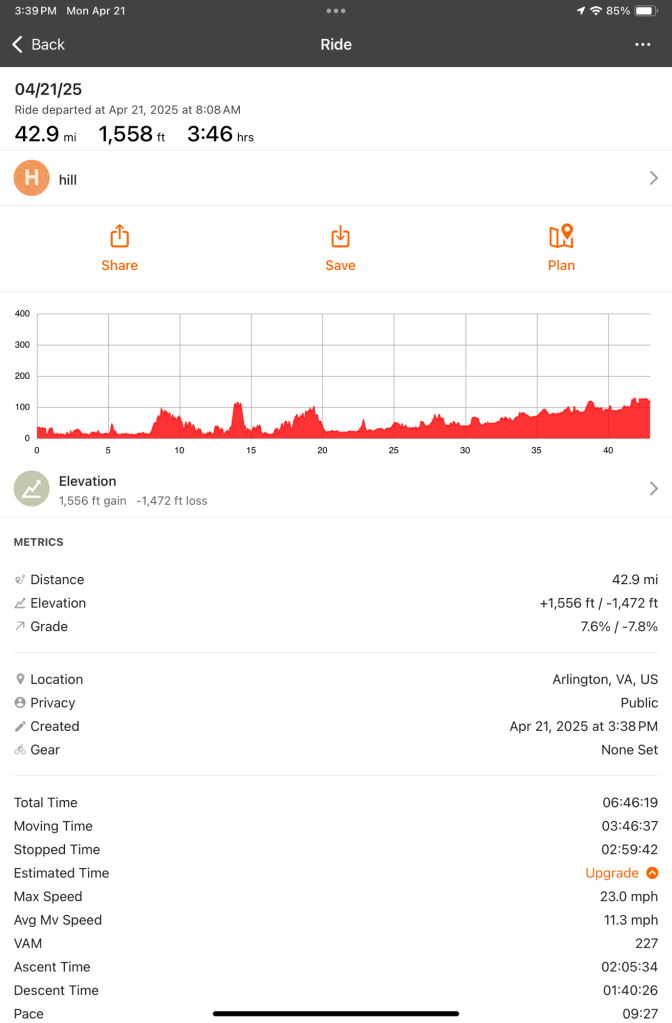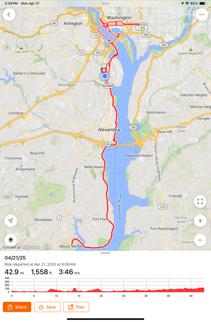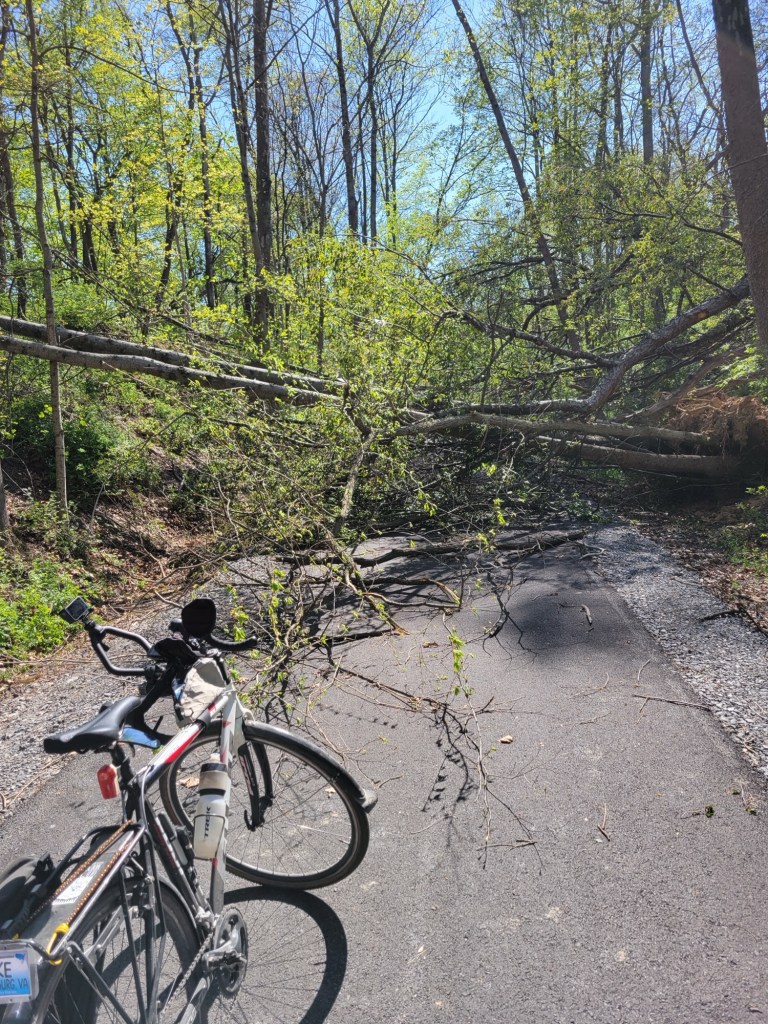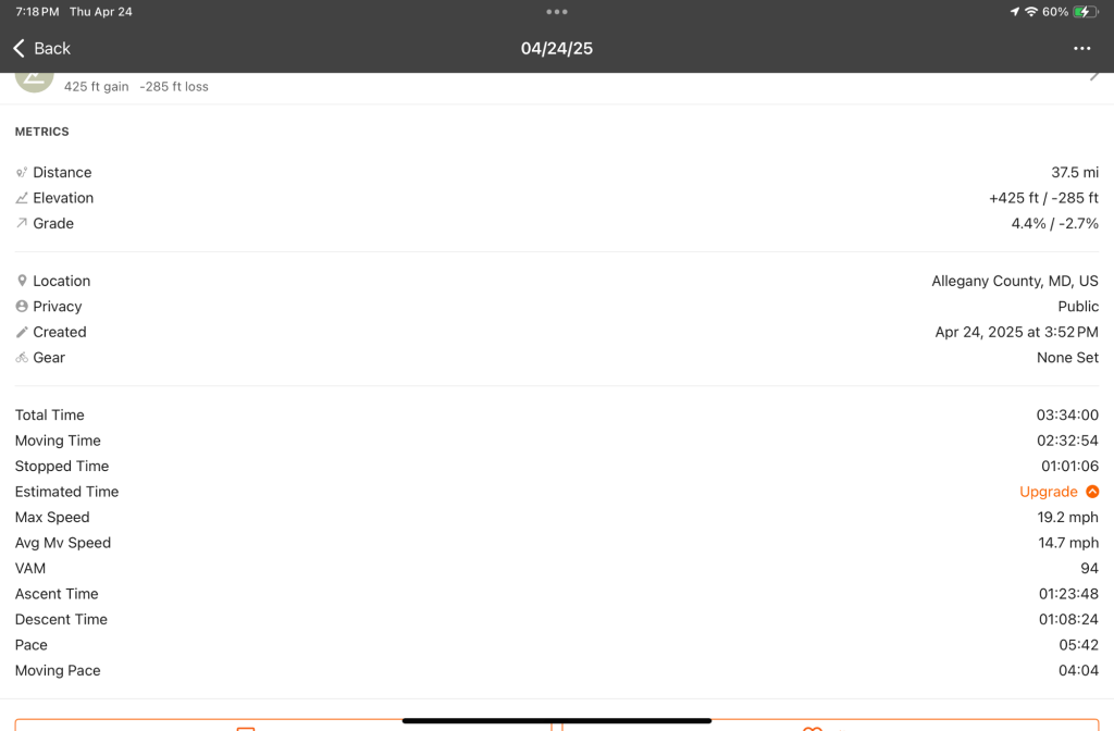 A good day today- 63 miles and 2,355 ft of elevation gain going from Pittsburgh to Wheeling, West Virginia. Nice weather starting off in the high 60s and getting into the 70s, partly cloudy. It was a bit windy in stretches and it was a dead-on headwind, so a bit challenging! And there were some nice hills- first getting out of Pittsburgh to the south there was a big one, and then right after we got into West Virginia a couple pretty challenging 9% grades. After that we dropped into the Ohio valley and followed a nice bike trail the last 20 miles or so along the Ohio all the way to Wheeling. Below are the RidewithGPS stats.