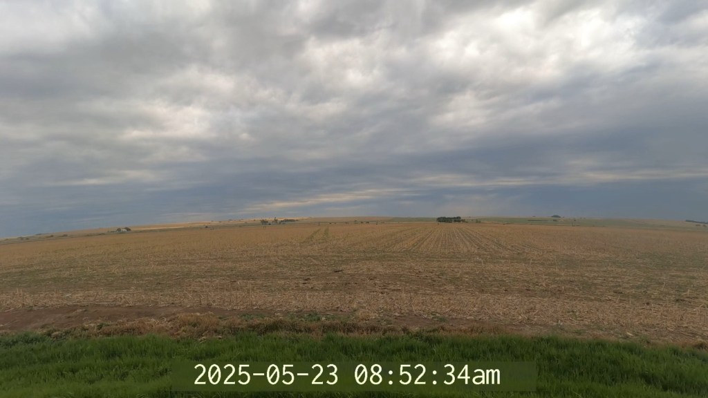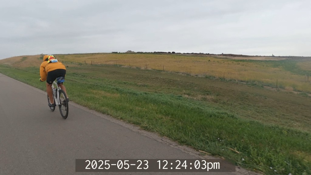 Going from Sterling to Briggsdale Colorado today. 60 miles, not much between the two towns except the Pawnee National Grassland. Prairie as far as the eye can see. It was again a cloudy day, a bit warmer than yesterday. It was drizzling rain periodically but we missed any major storms. Yesterday at Sterling where we camped at the public park there, we had several nice people stop by to warn us of tornados and hail. There was a tornado warning in the early evening and it did look pretty dark out to the North. Looking on the radar there was some significant storms activity there, but it passed us by and we didn’t get any rain last evening. One lady said that there were 4 tornados recently in the area, so even though we are pretty far north, this is a tornado prone area with very unstable weather. We were told that the nearest tornado shelter was a church a mile and a half away. Our instructions were if we hear a siren, we all pile in to the van and head to the church! Of course the lady said tornados can appear quite suddenly, not giving enough time even to alert folks. I’m not sure I would take the van and try for a shelter a mile and a half away, maybe head to the bathroom facility which is a cinder block structure. Another fellow walking his dog came by and told us that crack heads frequent the park between midnight and 5 AM, so best lock up all our valuables. The bathroom facility toilet was missing a door and a toilet seat- maybe to discourage drug users?? What kind of place did Adventure Cycling put us in?? Ah, but there were no issues last night. No odd noises and all our bikes were still there when we woke up. I actually slept quite fitfully on my nice new sleeping pad that doesn’t leak!
