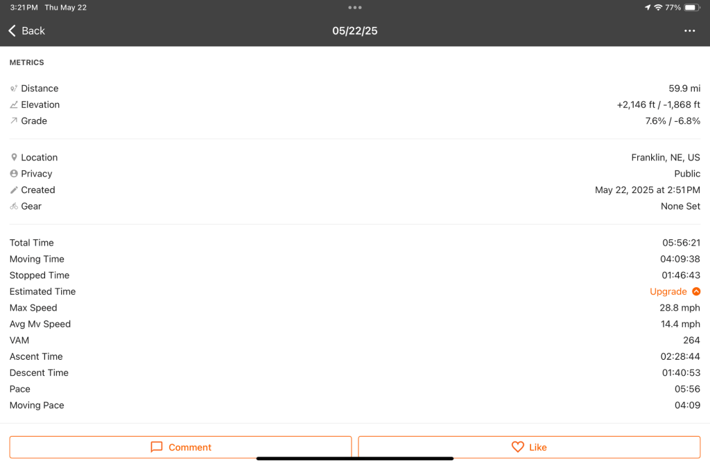 Going from Mankato Kansas to Franklin Nebraska. Another State in the bag! 66 miles and 1856 ft of elevation gain. Averaged 13 mph, the wind was MUCH better! Still a headwind, but relatively mild, 5-10 mph coming from the West/Northwest. A beautiful sunny day, starting off in the 50s and climbing to the 70s in the afternoon. Deb and I didn’t take the normal route as the other members of the group because we wanted to visit the geographic center of the 48 states which was off route by 20 miles or so. It is located 2 miles North of Lebanon Kansas. It was cool- no one was there except two guys changing the flags on the monument. Apparently the Kansas winds wreak havoc on flags! We experienced that first hand yesterday! It was a beautiful ride. After entering Nebraska about 10 miles North of the geographic center monument, there was a historical marker, marking a section of the prairie that was kept basically as it was since the white man made an appearance out here. It was beautiful flat, gently rolling prairie land for as far as the eye could see, 360 degrees. One can only imagine what it looked like when there were millions of buffalo roaming the prairies. It was really quite breathtaking. It is nice riding a bike out here- not much traffic although there are some big trucks that roll by at 70 mph, fortunately giving us bikers plenty of room as we ride on the road to the right, there not being any shoulder. Occasionally you will get the odd truck that zooms by with feet to spare, but that is rare, people are pretty respectful of bikers and giving them plenty of room when they are riding on the road. I ate lunch at Red Cloud, back on the original route, at a great little place called the Bowling Alley Bar and Grill (it is actually a bowling alley) and had a fish and chips. Caught up with the rest of the group a short way after Red Cloud and rode in to camp together with them. Another nice city park where we get to use the showers attached to the pool. Pools are not open until Memorial Day, hopefully after next week we will be able to not only use the showers, but the pool as well. Hot water had unfortunately not been turned on, so had a cold shower- but it felt great!!