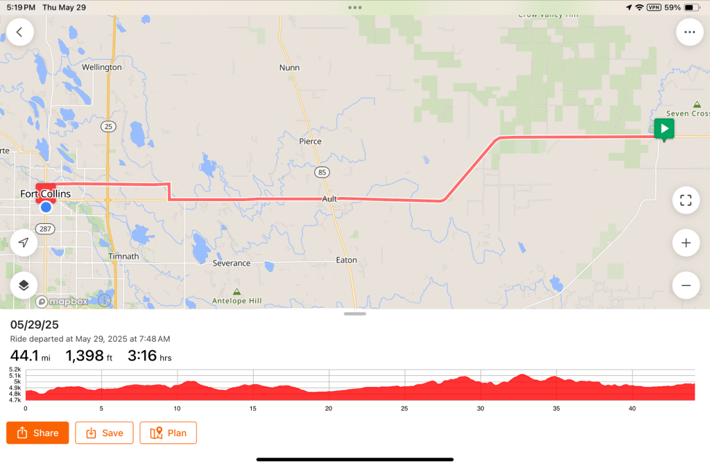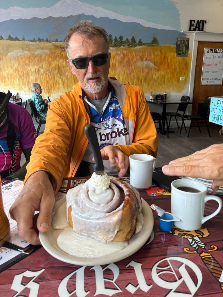 Going from Briggsdale to Fort Collins Colorado, a short 44 mile jaunt with a measly 1000 ft of elevation gain. A nice cool day- NO RAIN! Not much of a breeze and a straight shot pretty much due West to Fort Collins. Not much along the route except a continuation of the Pawnee National Grassland. Beautiful prairie land. As we approached Fort Collins the clouds were lifting and we started to see the foothills of the Rocky Mountains. Fort Collins is nestled in these foothills and will be the beginning of our journey into the mountains on Saturday. We stopped at AULT for coffee and pastries. AULT literally stands for “A Unique Little Town”. Well, it didn’t look too unique to us, the same small town with not much in it, but it did have a great coffee shop, Gray’s Cafe, where we were served by a very accommodating young lady, good coffee and an amazingly huge danish pastry which was deliciouso (as my wife Dayna would say). The ride was uneventful, although Tom’ son who had joined us just before AULT got a flat. Getting a lot of flats on this trip!