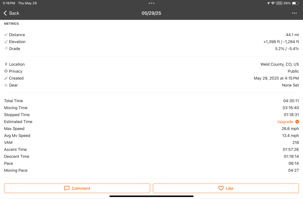 We got to Fort Collins and our Best Western Hotel where we will be staying for two nights, by 12:30. Check-in was a 1 PM, so several of us rode over to the Treks Bike shop 4 miles away to leave our bikes for a tuneup before we proceed into the mountains. I need a new rear tire, the current one is worn pretty bad after 2000 hard miles. I’m getting a Schwalbe Marathon+ which I’ve heard good things about. They need to replace the chain and rear brake pads and they will clean and lube the whole bike. After that I went to the nearby REI to return my Sea to Summit sleeping pad which was leaking. Got a full refund. I then took an Uber to get back to the hotel (yes, they have Uber in Fort Collins!!!). We are all going out to dinner tonight on Adventure Cycling and then tomorrow is a day off to hang out at Fort Collins- the most microbreweries here per capita of any town in the US! I get my own room for two nights which is nice as we are normally doubling up, but since several of our group had cancelled and ACA couldn’t change the reservations, several of us were treated to single rooms!