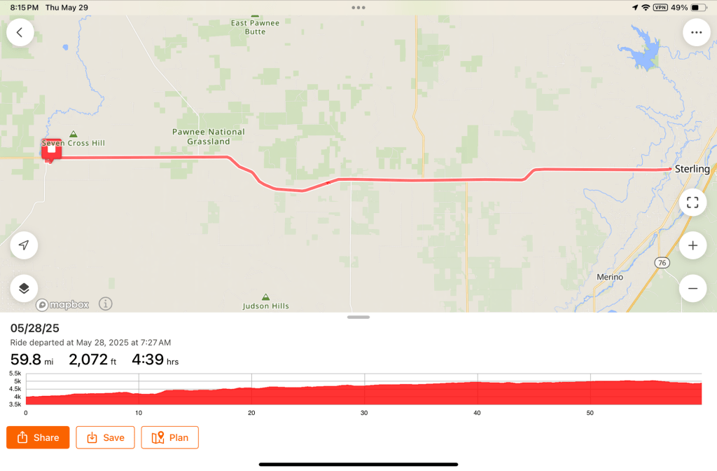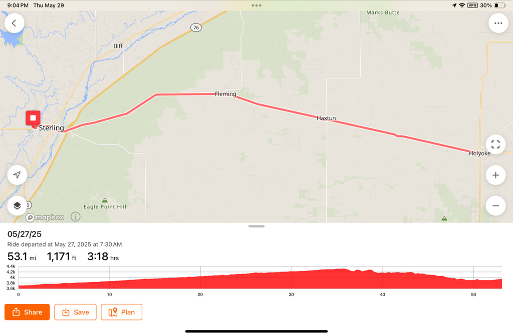 It continues to be really cool, cloudy and rainy. When we started out at Holyoke it was in the low 50s and it got into the low 60s by the time we got to Sterling. Clouds all day with some spattering of rain, but in Sterling in the afternoon the sun has come out! And promise of more sun to come. But the cloudy days are great for riding- no need to worry about sun block. As we get higher in altitude one has to be attentive to that when the sun comes out. We are currently at 3,950 ft at Sterling. We stopped at Haxton at a nice coffee shop for coffee and pastry, 18 miles into the ride, then at Fleming for a lunch break at 29 miles. Easy going, but when you stop riding you really cool down fast! I was anxious to get back on the bike just to warm up! Again, giant grain elevators at every “major” town. I stopped by the one at Fleming to inquire what they have stored in it. The guy said that they have wheat and millet. Wheat for the feedlots to feed the cattle and millet for bird seed. We have seen a lot of trucks on Rt 6 carrying grain from these grain elevators.