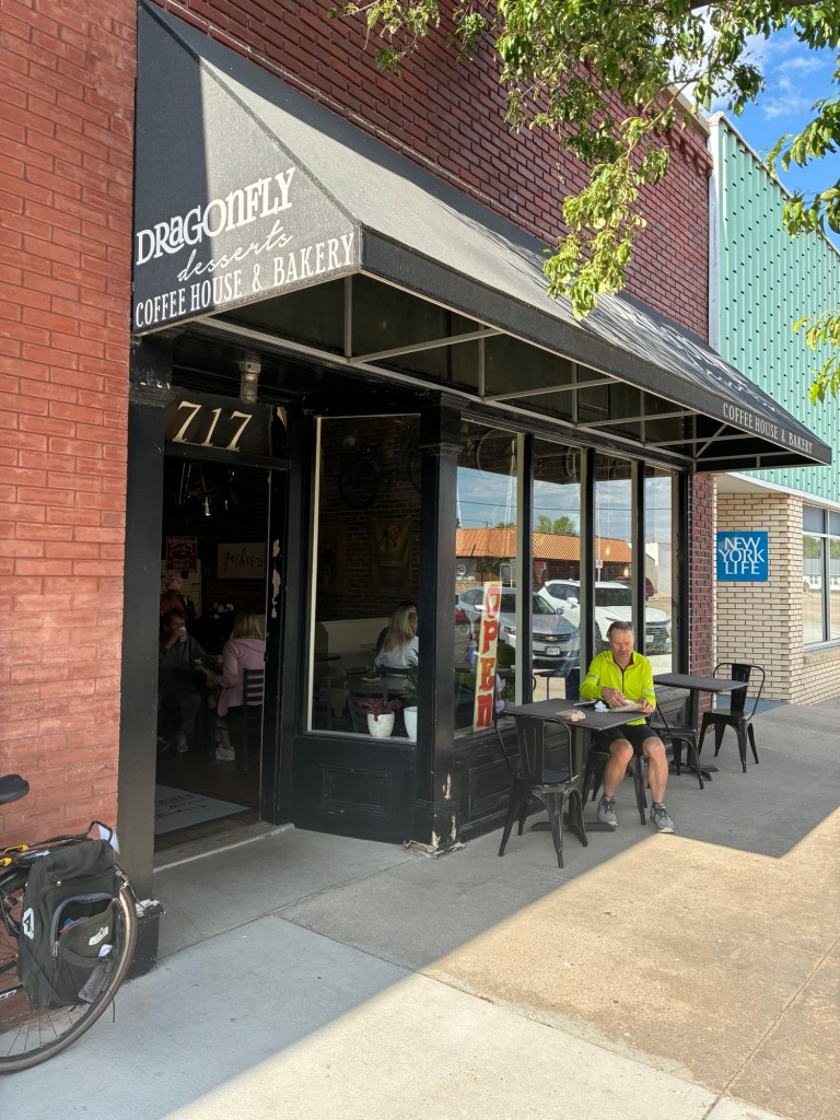 We stopped at a coffee shop in Cambridge for coffee after 15 miles, then stopped for lunch at Indianola at 28 miles. Taking our time today with such a short ride. Passed several cattle feedlots- what a smell, and sad to see all those cows packed together like that- but then I start thinking of the steak I am going to have tomorrow night….