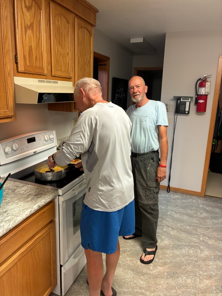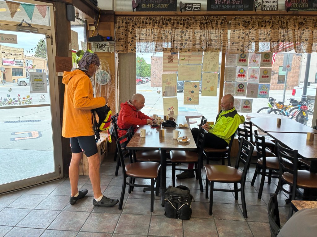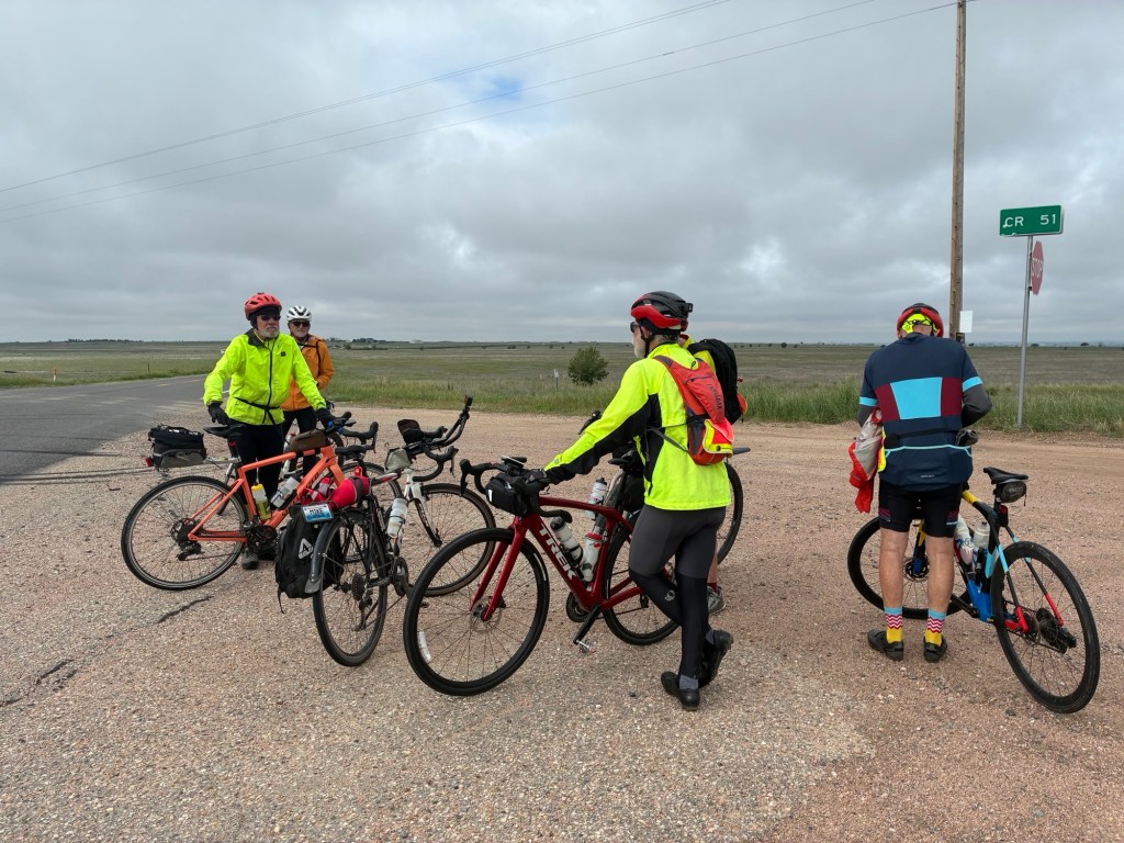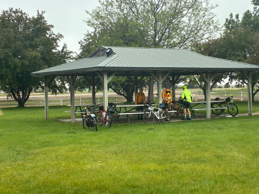 Imperial Nebraska to Holyoke Colorado- a short day today, only 38 miles and a paltry 102 ft of elevation gain. It was a bit drizzly and cool, but with a little tailwind it was a good riding day. The countryside looks beautiful in the gray mist- it has gotten real flat- the precursor to the foothills of the Rocky Mountains which we will be entering the end of the week. Because it was a short ride, Chet and I who were the cooks for last night’s dinner and today’s breakfast and lunch, decided we could make scrambled eggs, bacon and pancakes. After all, we had just a couple hours of riding today. So we started later as well- breakfast and 7:30.