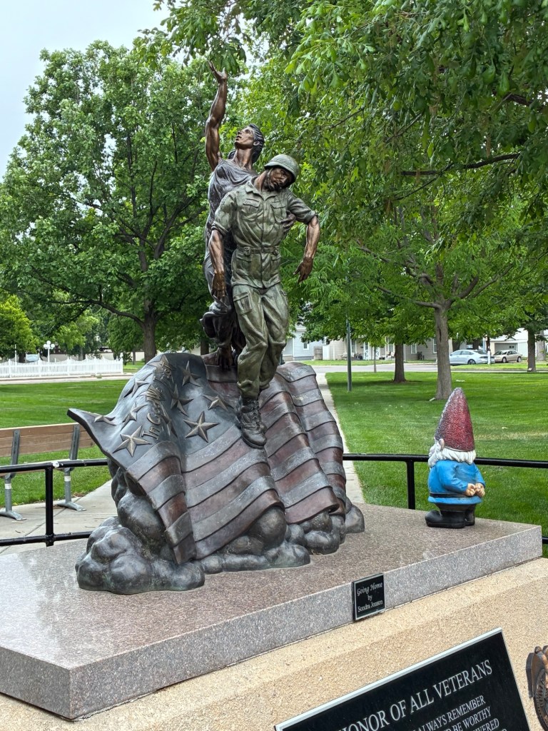 Veterans Memorial in Norris Park- what is with the little gnome on the right??