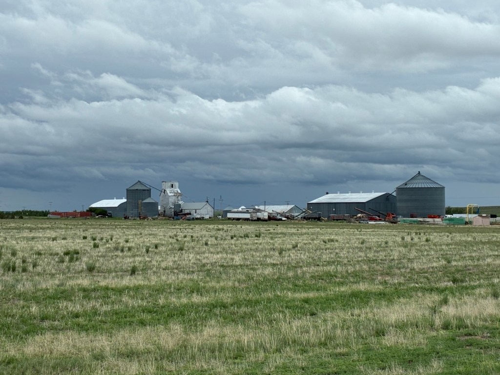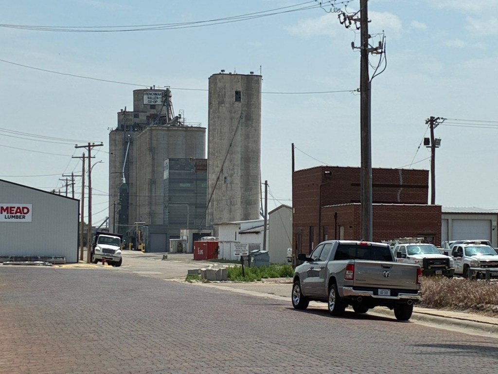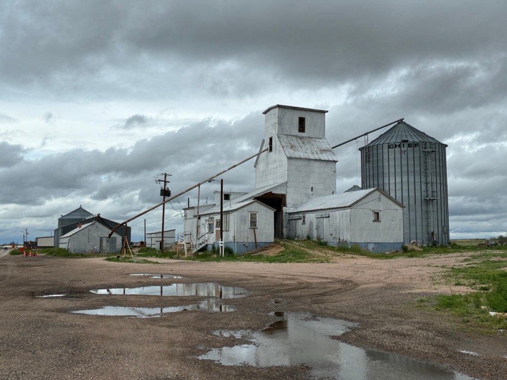 Huge grain silos along the rail line, owned by the Frenchman Valley Coop