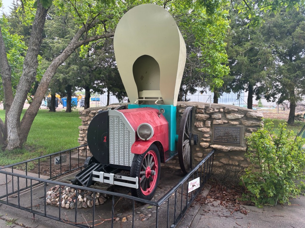At Fleming rest stop- interesting memorial to the various modes of transportation the settlers used moving West -