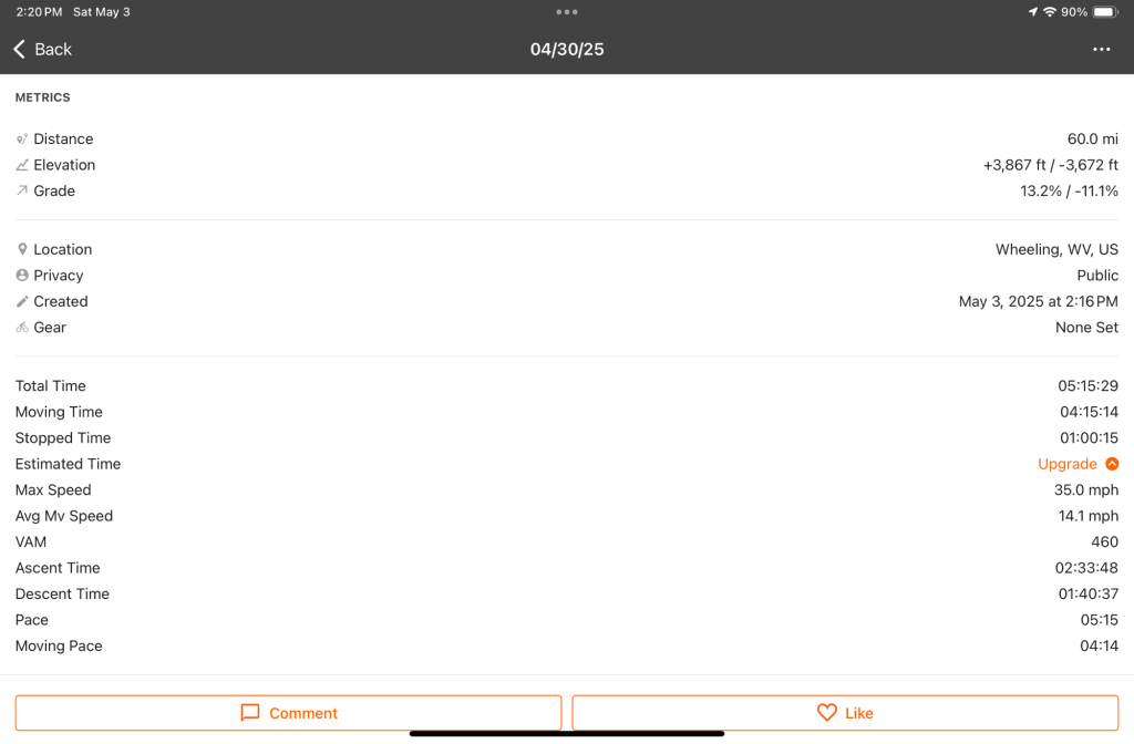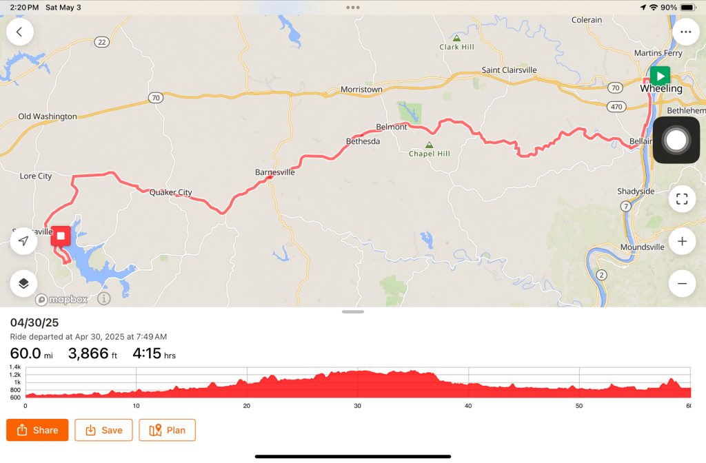 We went from Wheeling West Virginia to Seneca Lake Park in Ohio today. 60 miles and 3800 ft of elevation gain. Ugh! It was as advertised- rolling hills all the way- up and down, up and down. It was the perfect day for it however- started off cool, in the low 60s and getting into the low 70s later in the ride- not much wind, clear and sunny. I tell you, I am glad I am not lugging around all my camping gear- we had some pretty steep grades, several around 10% and one to 16%! But while strenuous, it was doable- I am definitely getting my biking legs. This is a good practice for the Rocky Mountains later on. We stopped at Barnesville for lunch, about 35 miles in, and Tim, Than and I got in to camp around 1:30. So a fast ride. We have a great camping site on Seneca Lake, right on the lake. It is still calm and sunny, no rain in the forecast and we will be eating shortly. Worked up quite the appetite.