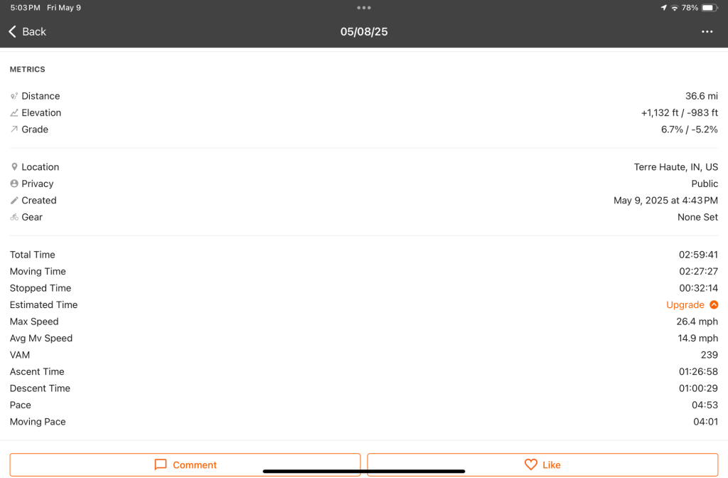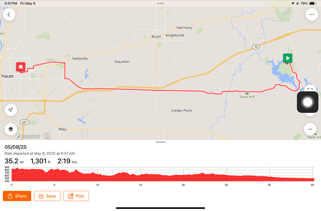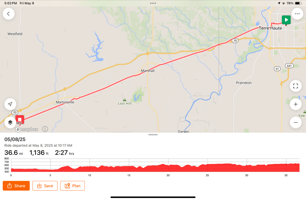 I broke into two segments because I had to restart my GPS halfway through in Terre Haute.