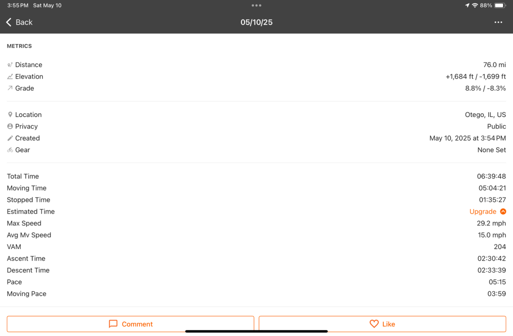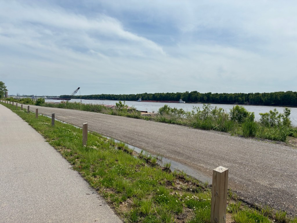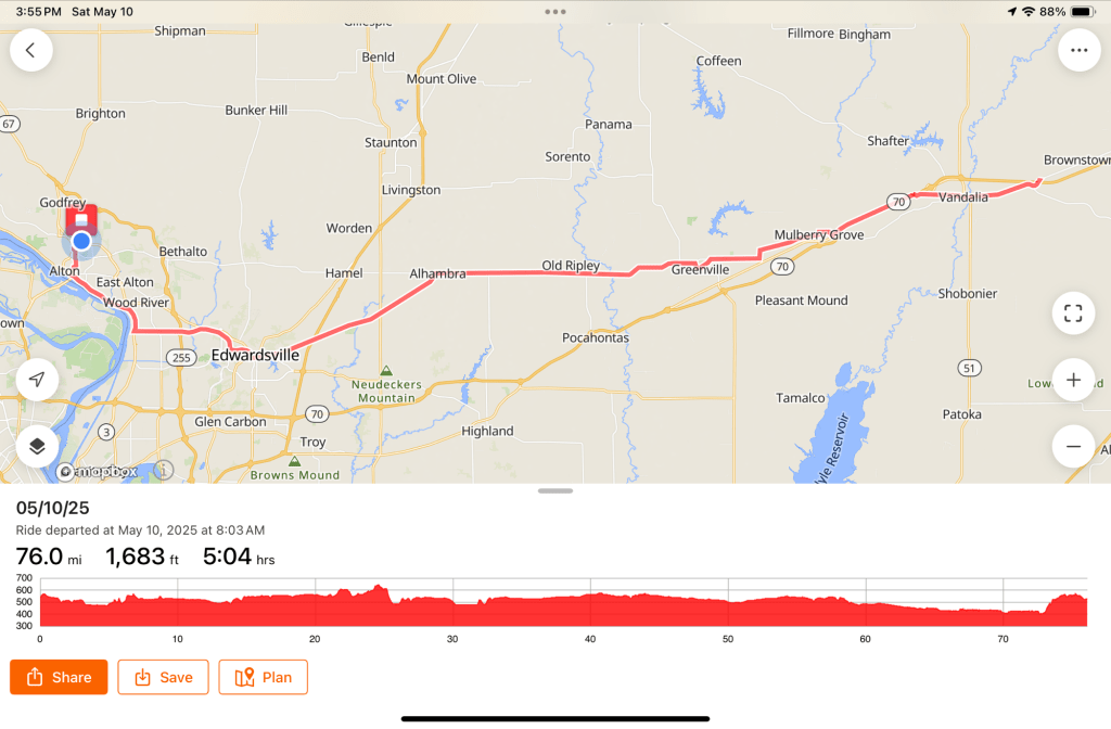 Going from Vandalia to Alton Illinois, 76 miles and 1600 ft of elevation gain. Another great day, similar to yesterday- started off cool and warmed to the low 70s, nice tailwind breeze, sunny skies and not much up and down. Mostly flat terrain, the same as yesterday with large farms and small towns here and there. The towns are convenient for rest stops. I stopped at Greenville for a cup of coffee, then treated myself to a cheesesteak and waffle fries at the halfway point at Alhambra. There we picked up a nice bike trail which took us off and on all the way to Alton. It was something to see the mighty Mississippi, about 5 miles before we reached Alton. There was a HUGE barge being pushed upriver by a tugboat near the Melvin Price Locks and Dam, one of the largest locks on the Mississippi River. Quite something. The bike trail went along the river North to Alton, where we had to bike through some sketchy neighborhoods to get to our Super 8 Motel. Yes, we are staying at a Motel tonight! No need to pitch tents. Always nice to have a bed to sleep in once in a while- haha.