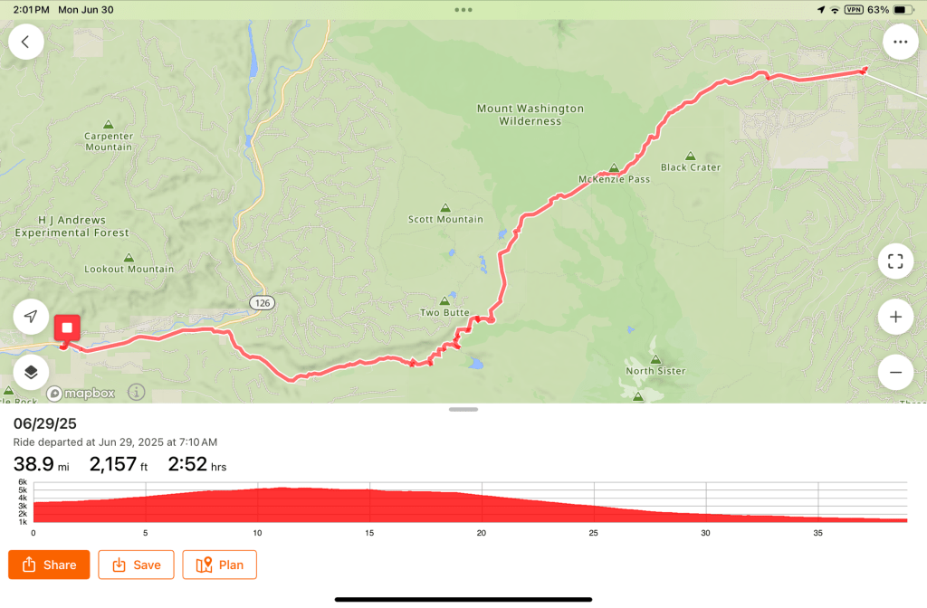 Sisters to McKenzie Bridge today. Not too long but a good climb up to McKenzie Pass then a fun twisty downhill run through the western side of the cascades to McKenzie Bridge campground. Another early start- folks wanted to beat the heat and the wind. As it was, we started off it was in the low 50s and during the climb to McKenzie Pass it didn’t reach the low 70s. Beautiful blue sky, no wind and perfect temps made for an easy 2100 foot climb to the pass. The beautiful pine forest turned into burnt out tree stumps as we climbed higher. Work of previous forest fires and probably more pine beetle blight, but the forest was decimated as we climbed to the top of the pass. Near the top the terrain turned volcanic- a lot of black basalt block jumbles interspersed with small pine trees that were trying to grow. Really cool. As we climbed we got better and better views of the 3 Sisters volcanos on the left (South) and other snow covered mountains to the right. At the top of the pass there was a lookout station made of basalt rocks where we got incredible views of all the volcanic mountains in the area, with huge fields of these basalt rock piles all around and pine trees sticking up here and there. The downhill run was LONG and TWISTY! Through really a really dense pine forest- no evidence of fire or beetle damage on the West side of the mountains. They were having a bicycle race going up to the pass as we were screaming down. A lot of riders, I would say at least 100, in various stages of the climb. They were going fast up that hill- pretty impressive. It was basically downhill all the way to McKenzie Bridge- a VERY small town with a small store and a pub. We passed it on the way to our primitive campsite. In a beautiful pine forest- sooooo quiet! We all got into camp by noon as it was as a short ride and we started out at 7 AM. We went in the afternoon to the Belknap Hot Springs, 6 miles down the road for a really great soak in their hot springs pool and a nice shower. Completely relaxed now as I write this blog with a nice cold beer in my hand. No pains at all- I feel I could ride my bike every day like this for the rest of my life! Ha. I will fast get out of shape when I get back home, I’ll have to be careful what I eat when I stop exercising so much- turn into a fat toad!